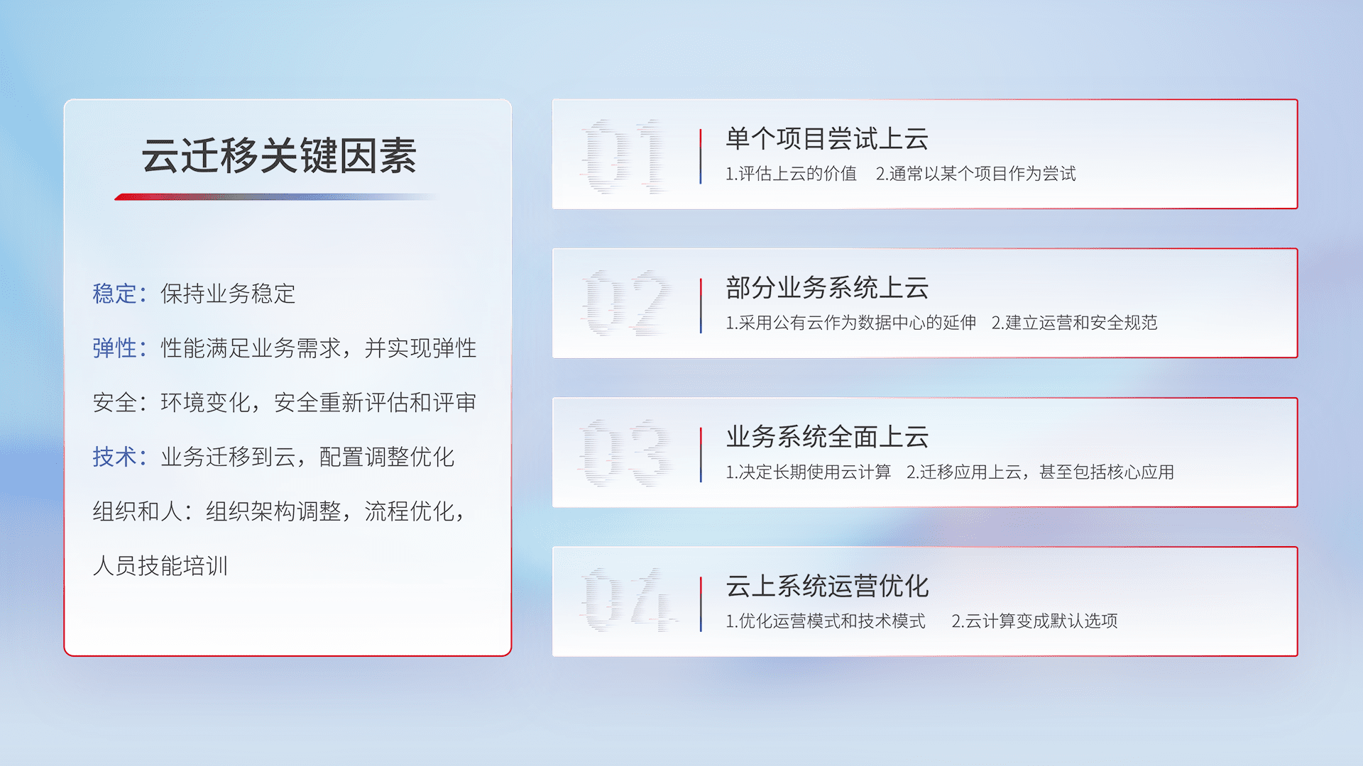 结合实际业务,,,,从规划设计、、、云平台选型、、、、云原生改造、、、数据迁移、、、集成交付,,,迁移全过程为客户识别最佳上云路径,,,做好风险识别管理,,设计网络架构、、、身份权限、、、、安全审计合规、、操作审计、、日志审计、、监控告警策略、、、多站点容灾设计等,,,,对云上基础设施进行整体规划,,,提升IT治理水平,,,以满足弹性、、、高可用、、、高性能的需求。。