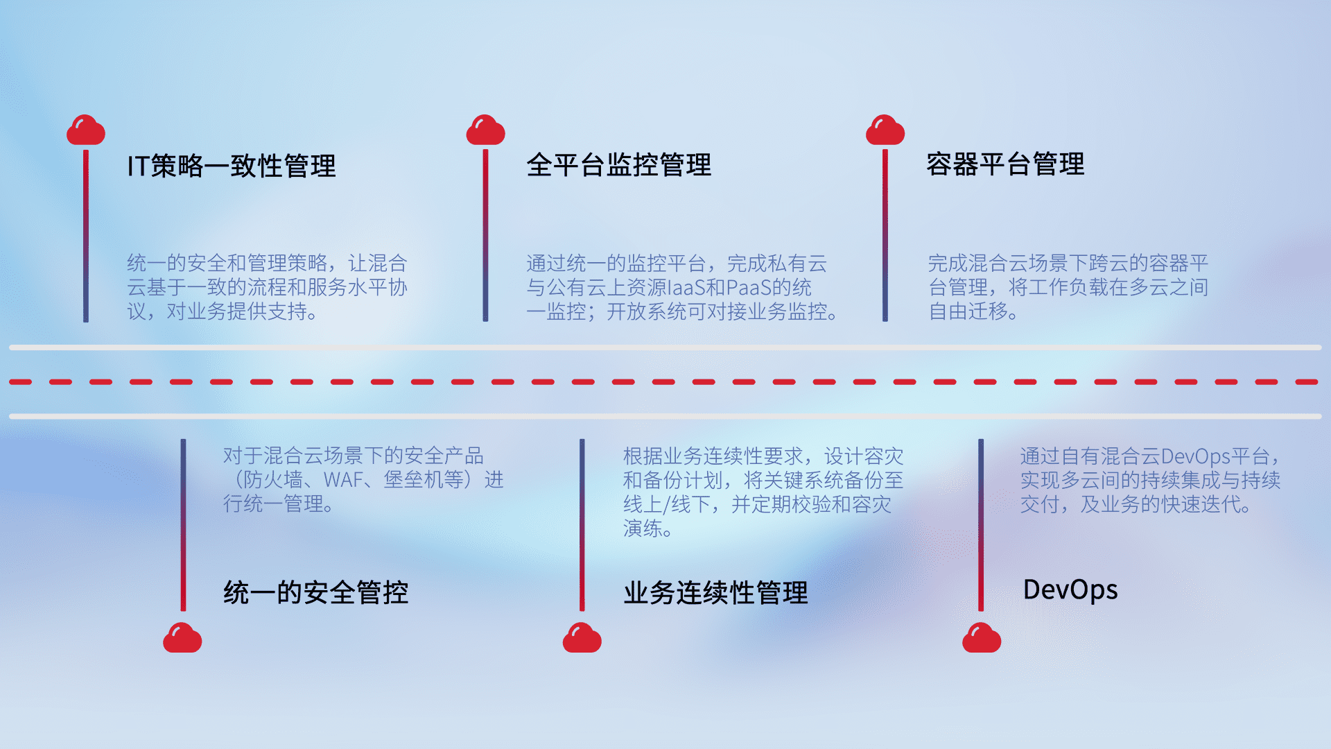 通过多云纳管,,以统一的资源数据模型把客户的云资源进行抽象和封装,,,进而实现对多云资源的统一操作,,,保障云资源管理的可靠性、、、稳定性与可用性。。。量身定制化运维内容,,,配置、、开发运维、、、、补丁管理、、备份、、监控、、、、认证和访问管理、、、、审计和日常巡检等,,,保障在用云过程中的可靠度,,,,稳定度以及高可用率。。