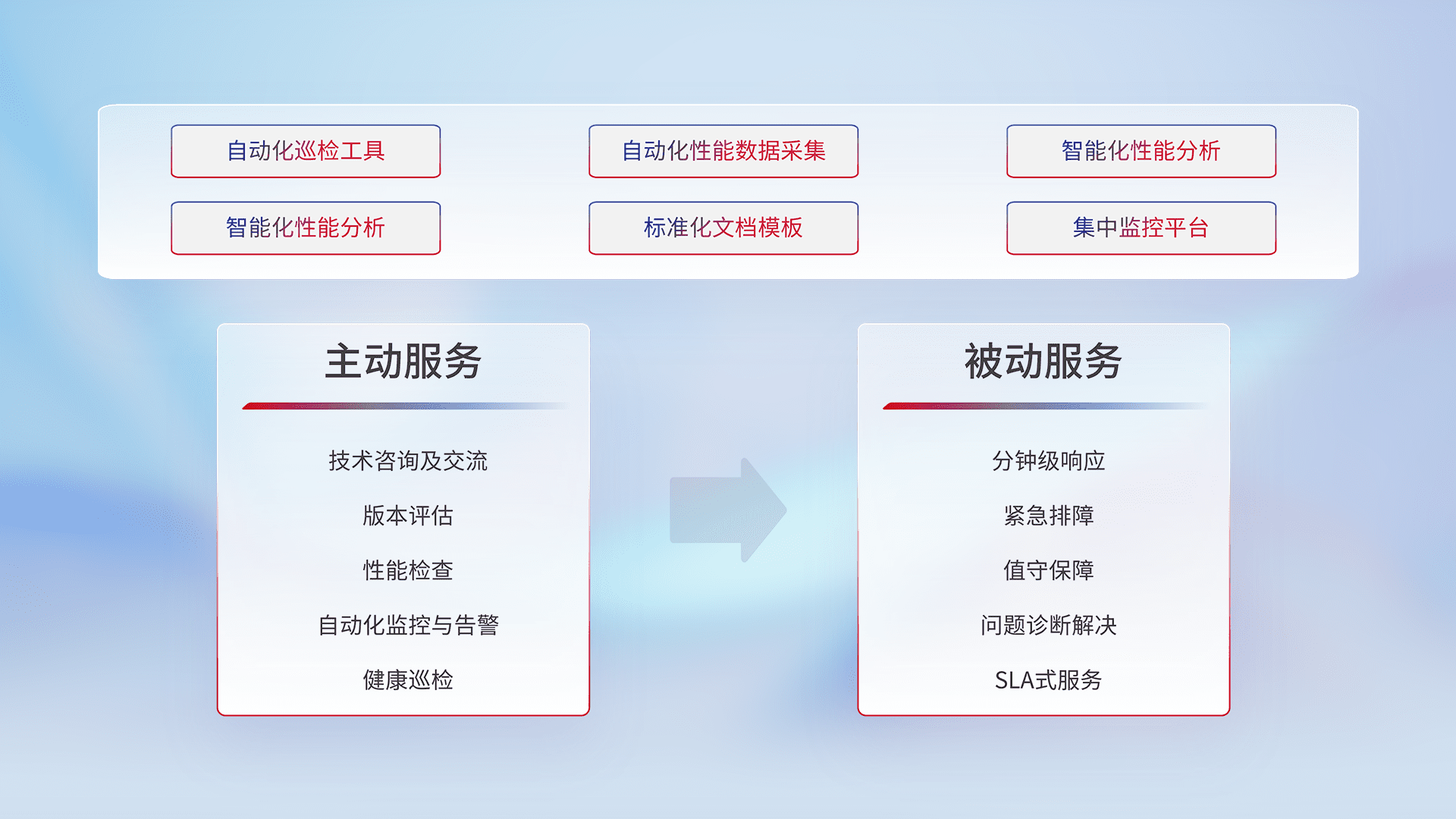 智能化工具和标准化文档,,,,保障服务质量,,,提供主动服务(包含技术咨询、、、、版本评估、、、性能检查、、自动化监控与告警、、、、健康巡检)和被动服务包含(分钟级响应、、、、紧急排障、、、值守保障、、问题诊断解决、、、SLA服务)。。。。